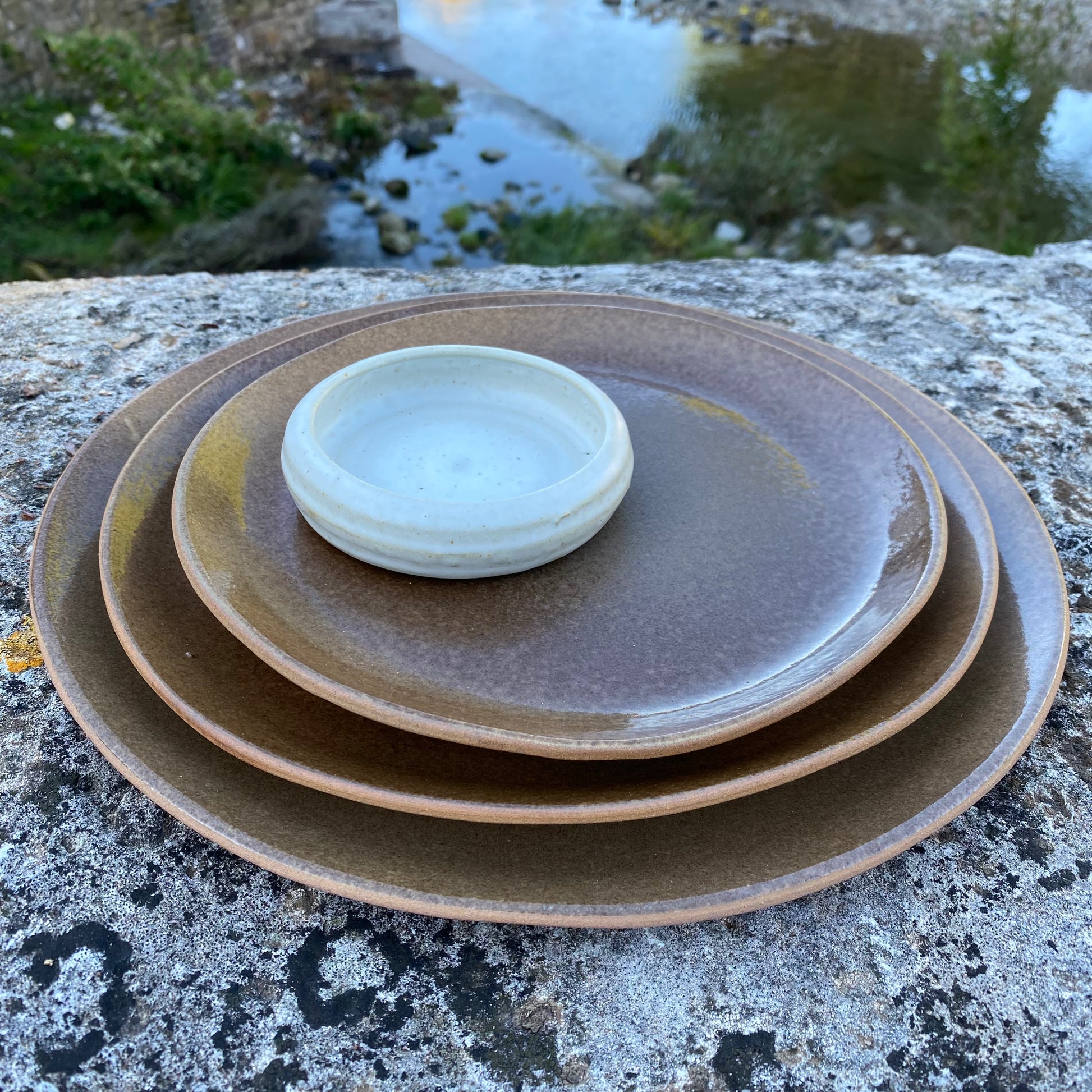 Faites à la main, ces assiettes de présentation peuvent se décliner en trois tailles 28, 26 et 21 cm. Elles sont en terre rouge comme les schistes. Emaillées mat.