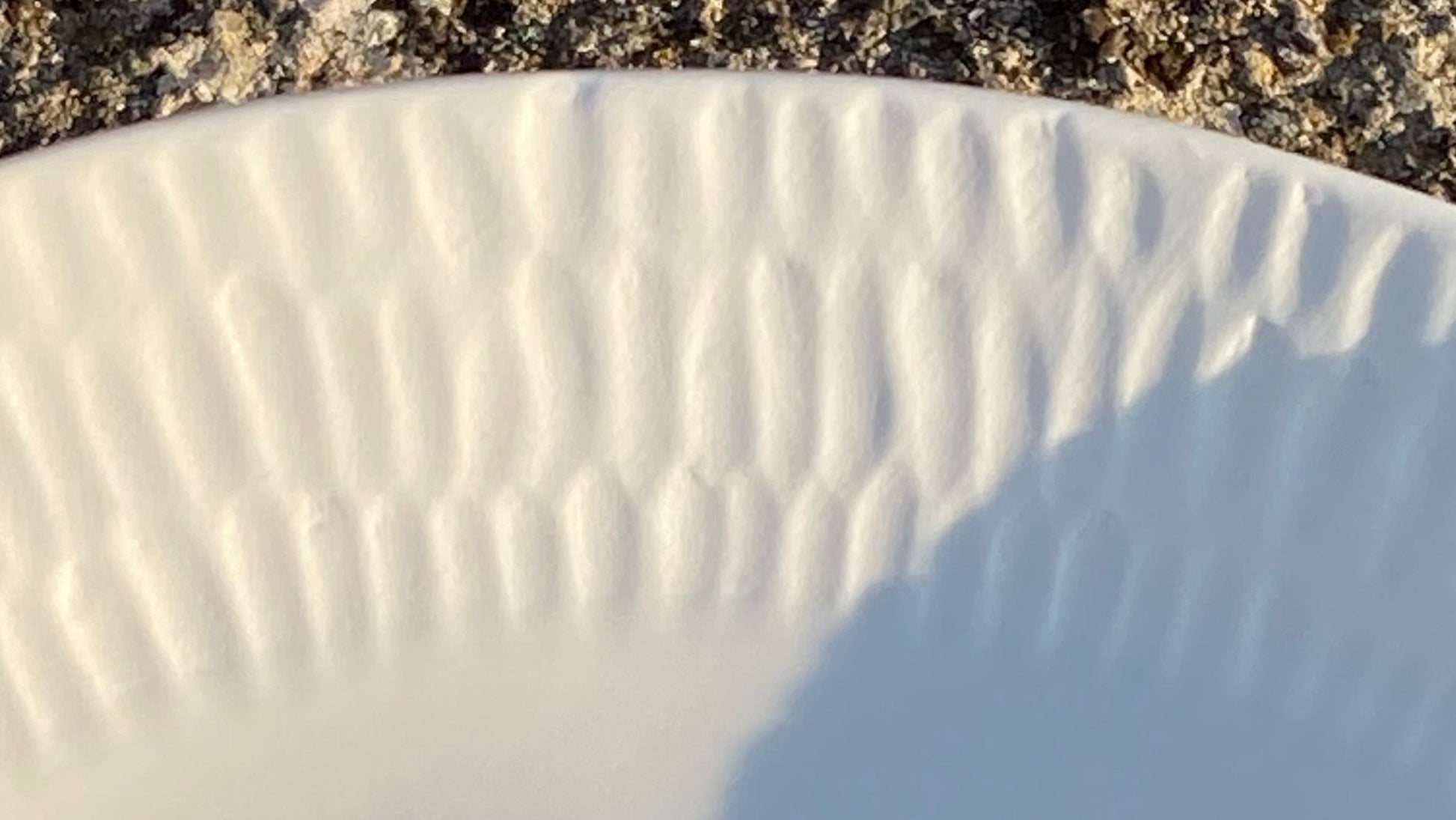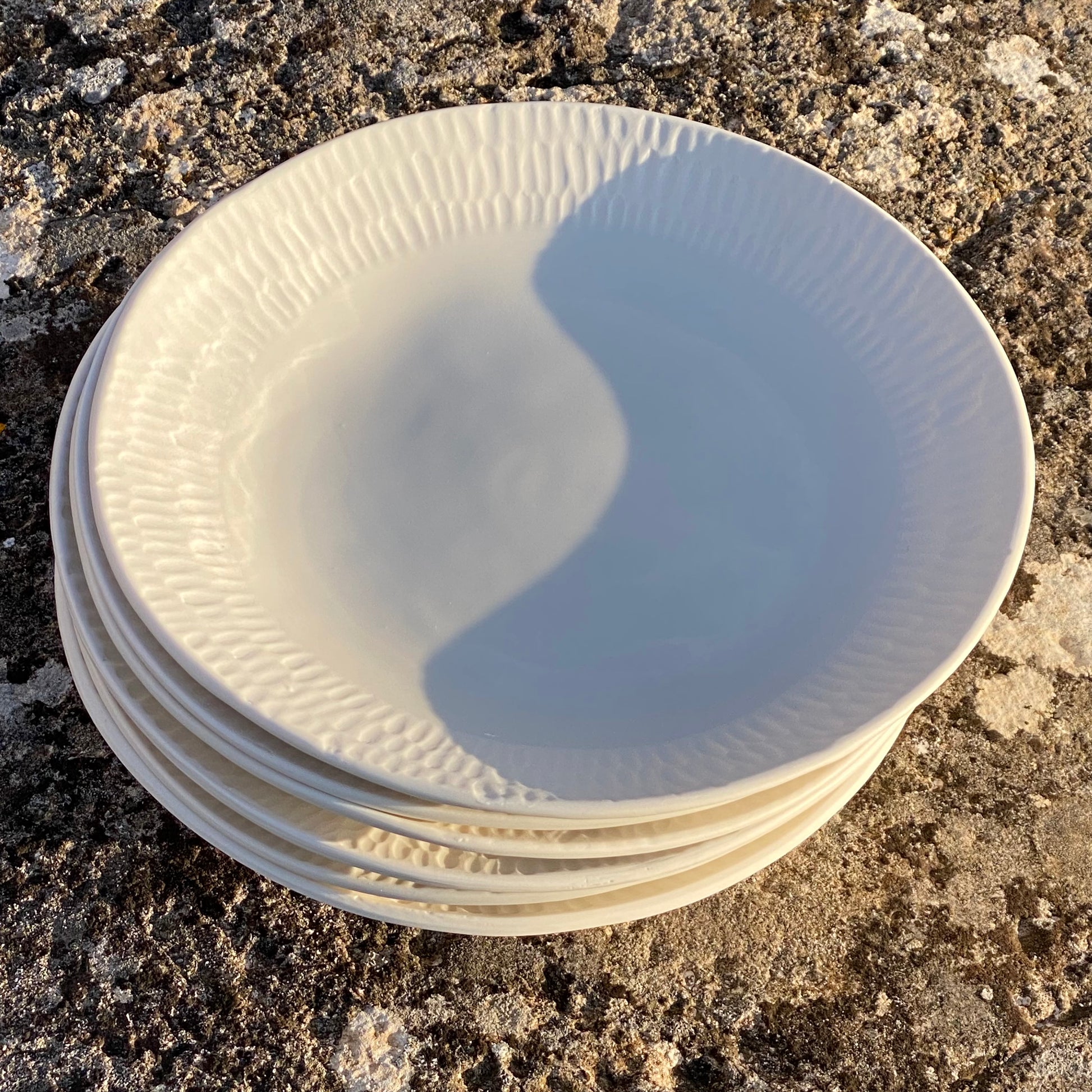Grande assiette en porcelaine MING, ronde et sculptée pour évoquer des grains de riz par les scarifications faites à la main.