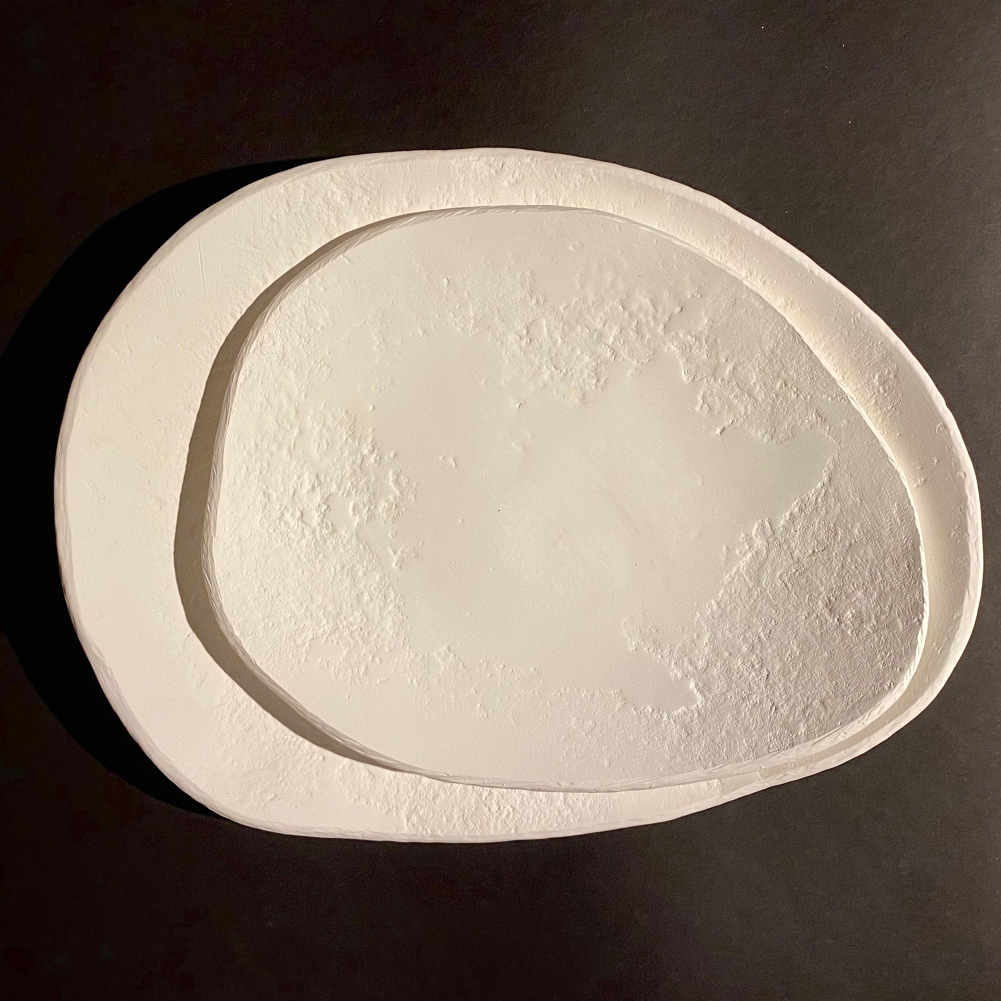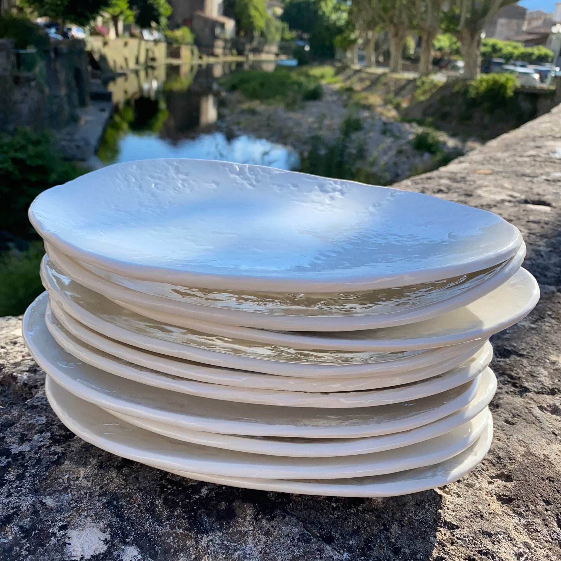 Assiette en porcelaine de 23 cm, faite à la main chez [pɔtʀi]. Blanche comme la nacre des huitres, incurvées et imprimées d'un relief de roche.