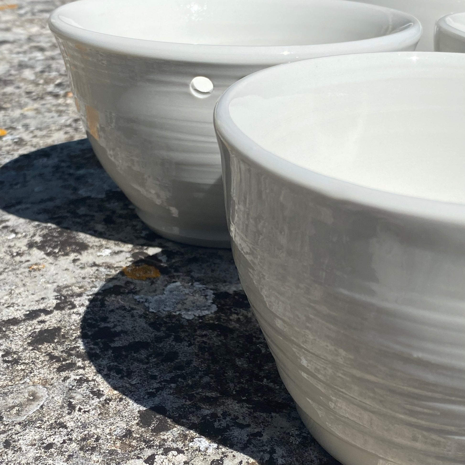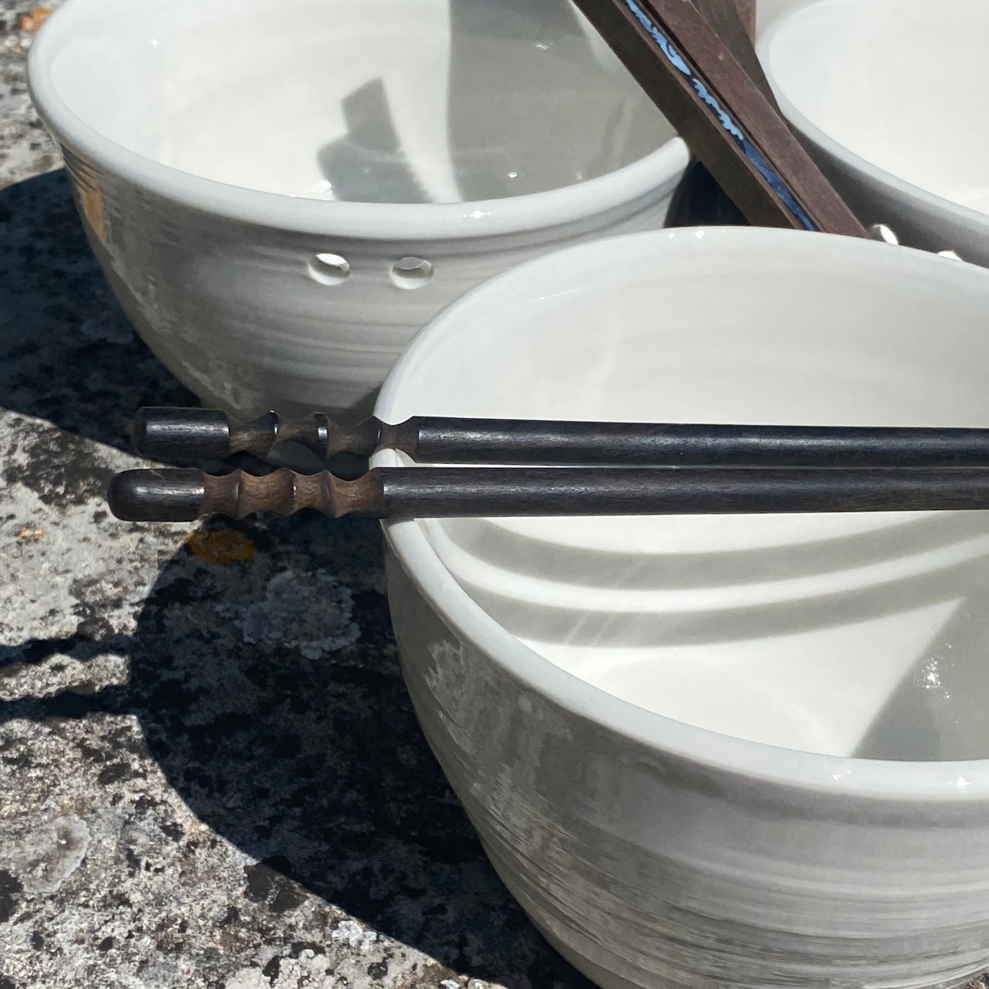 bol en porcelaine de 15 cm, fait à la main chez [pɔtʀi]. Blanc, percé deux fois pour loger les baguettes.