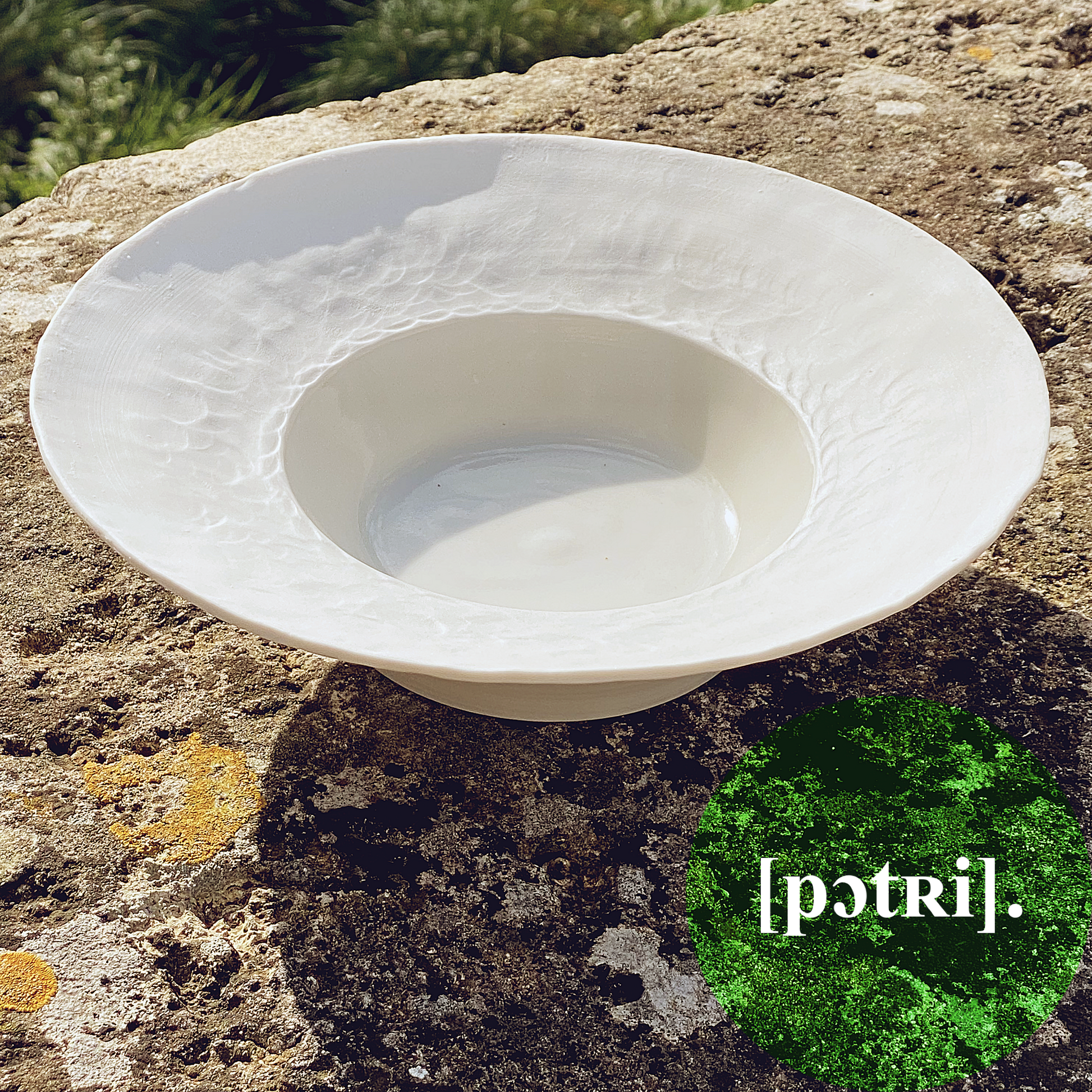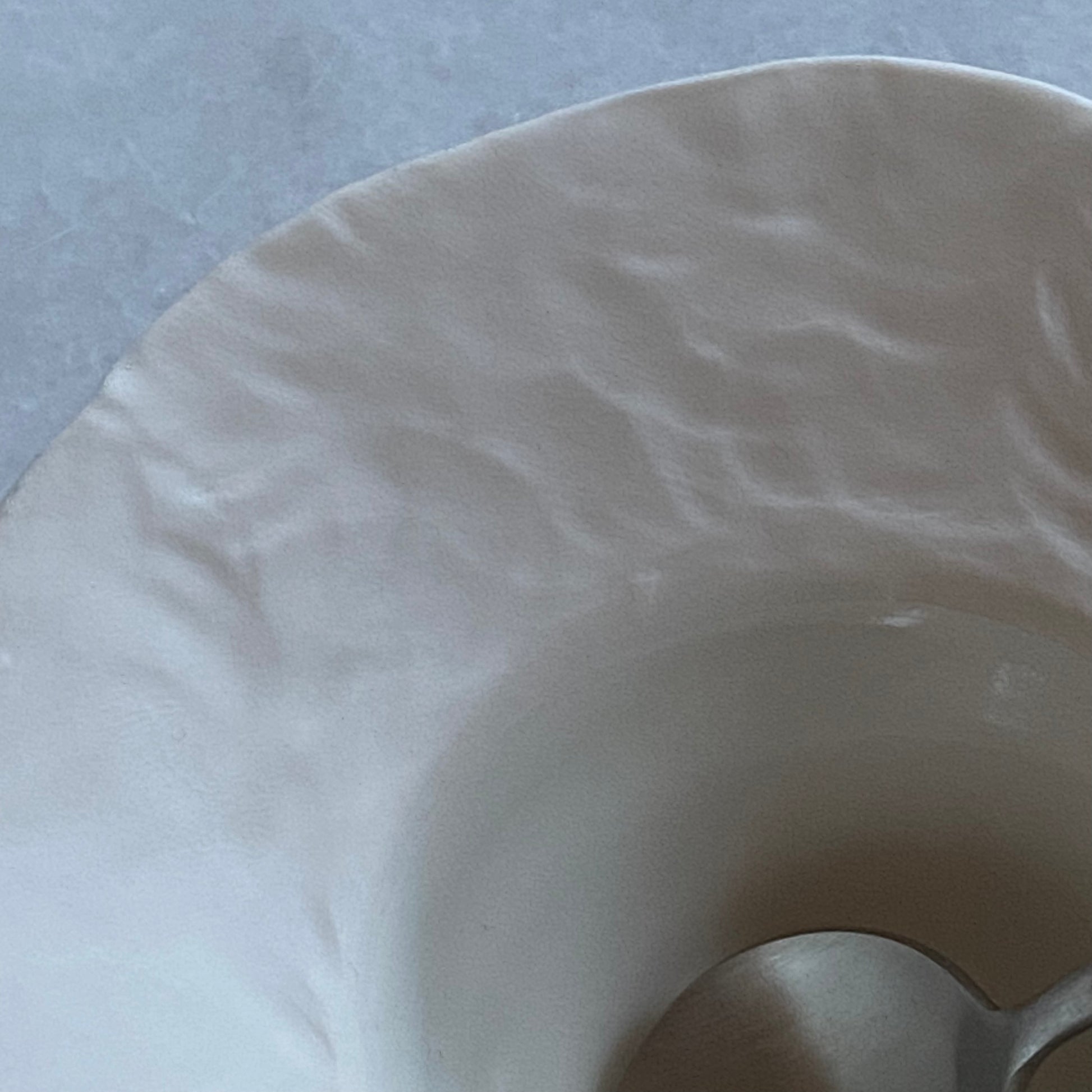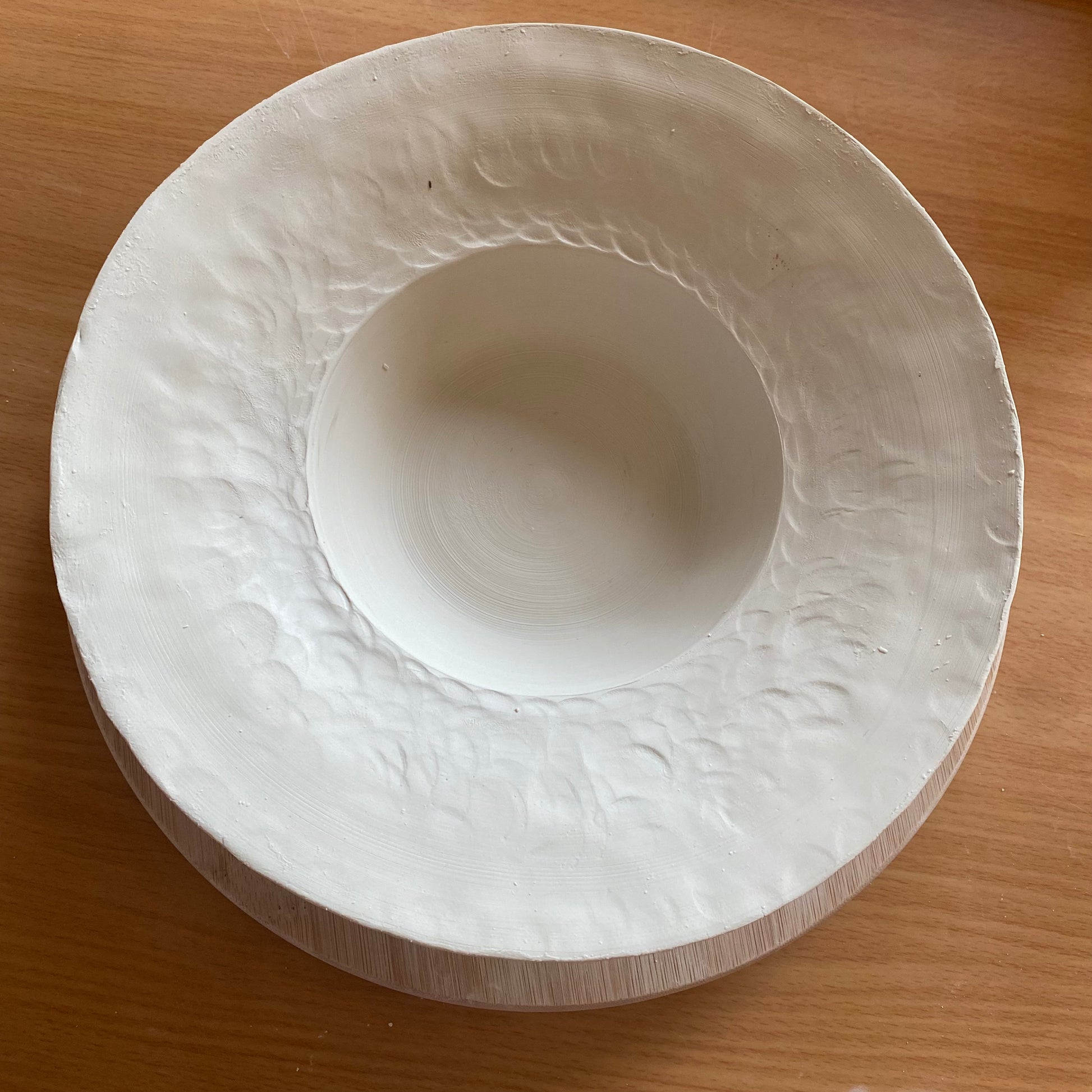 Grande assiette en porcelaine MING, ronde et modelée pour évoquer le martelage impossible de la vaisselle par un travail délicat fait à la main.