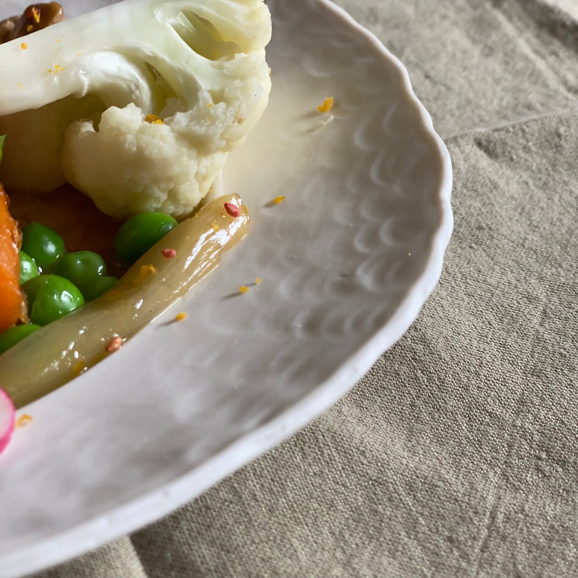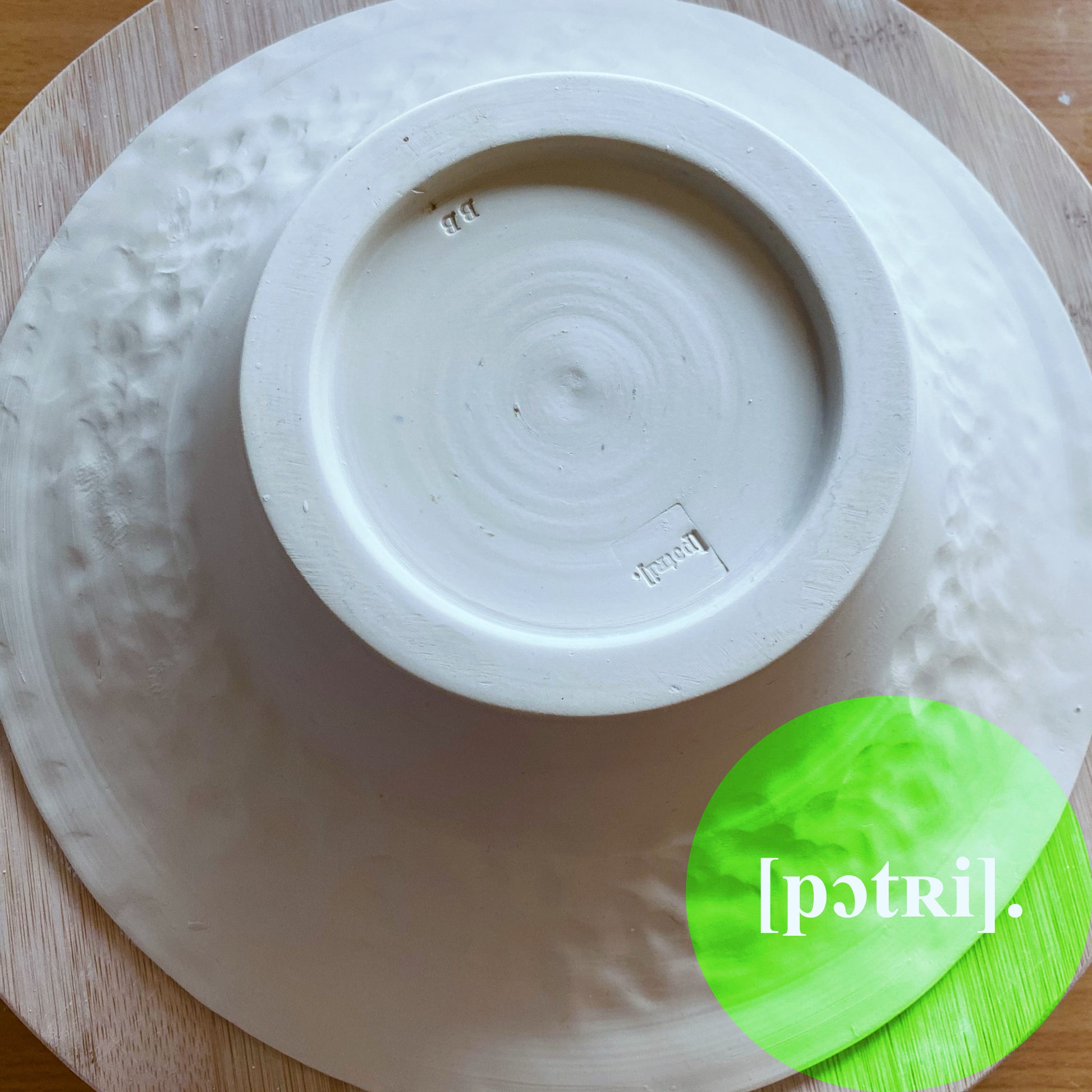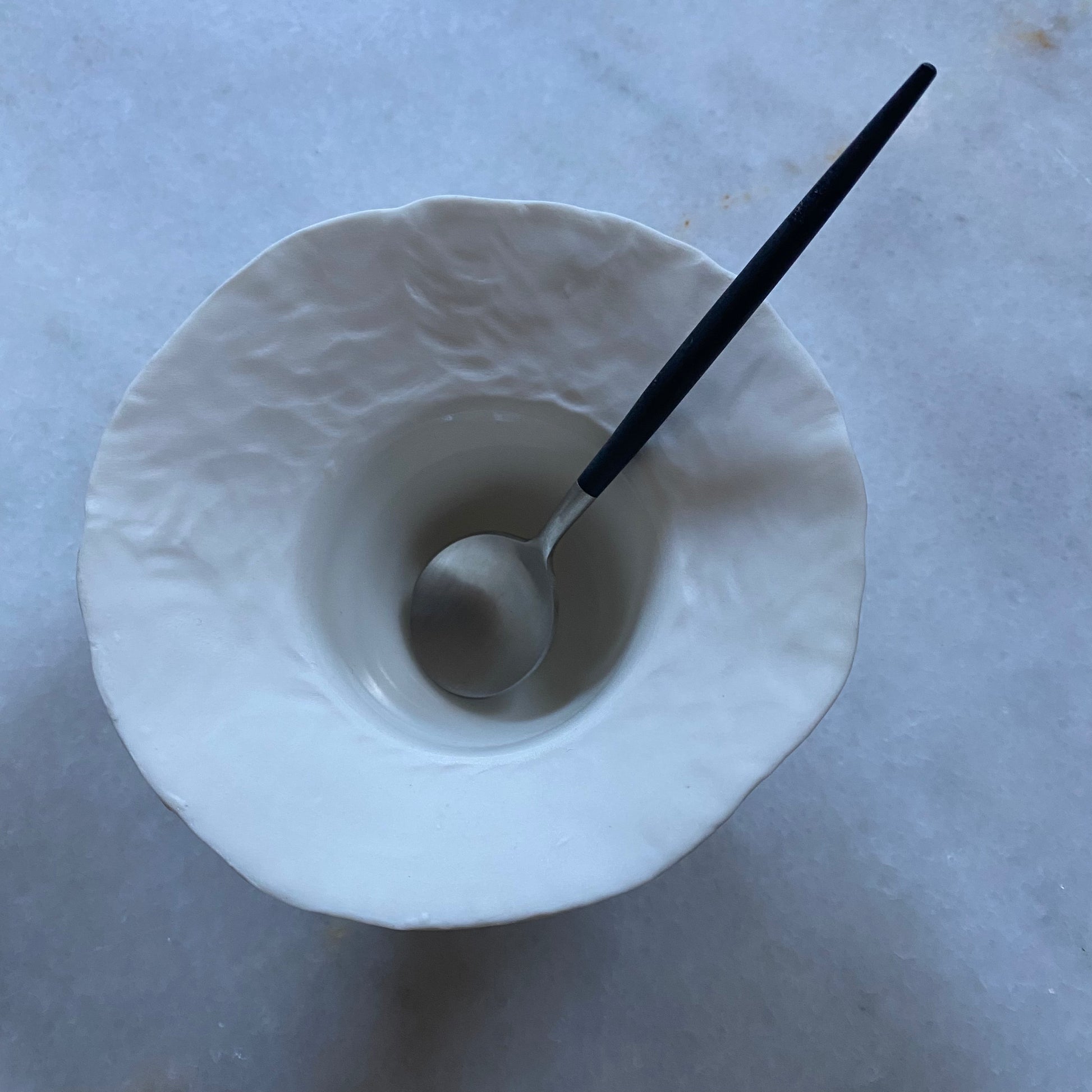 Grande assiette en porcelaine MING, ronde et modelée pour évoquer le martelage impossible de la vaisselle par un travail délicat fait à la main.